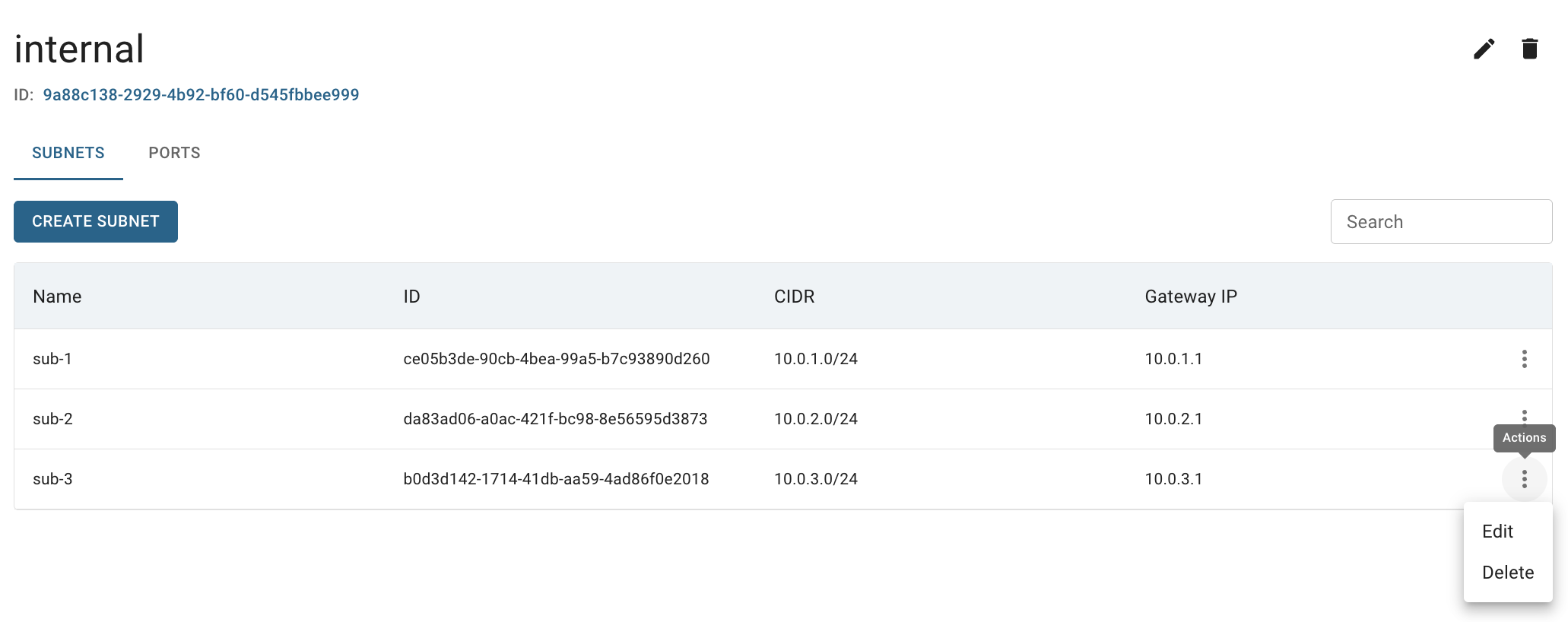 On this page, you can view and manage all Subnets and Ports associated with the selected network.