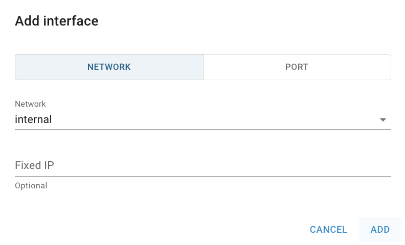 💡 You can add an interface to a Virtual Machine either by selecting a Network (to create a new port automatically) or by attaching an existing Port.