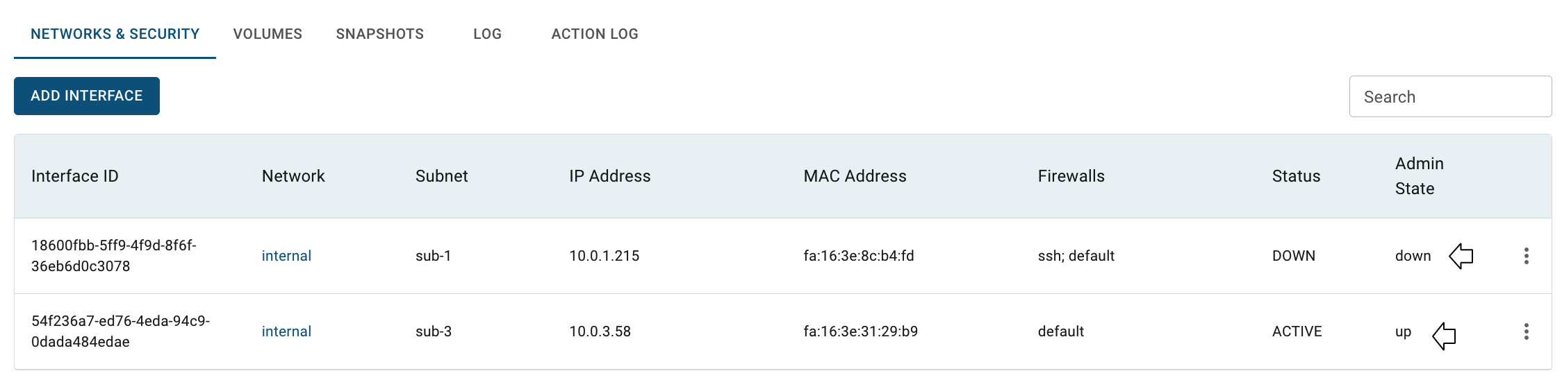 In this article, we are interested in the block of information, where you can find all Networks, Subnets and Interfaces related to the corresponding VM with the Add Interface button, Search bar and Actions icon, which opens a list of available management actions: