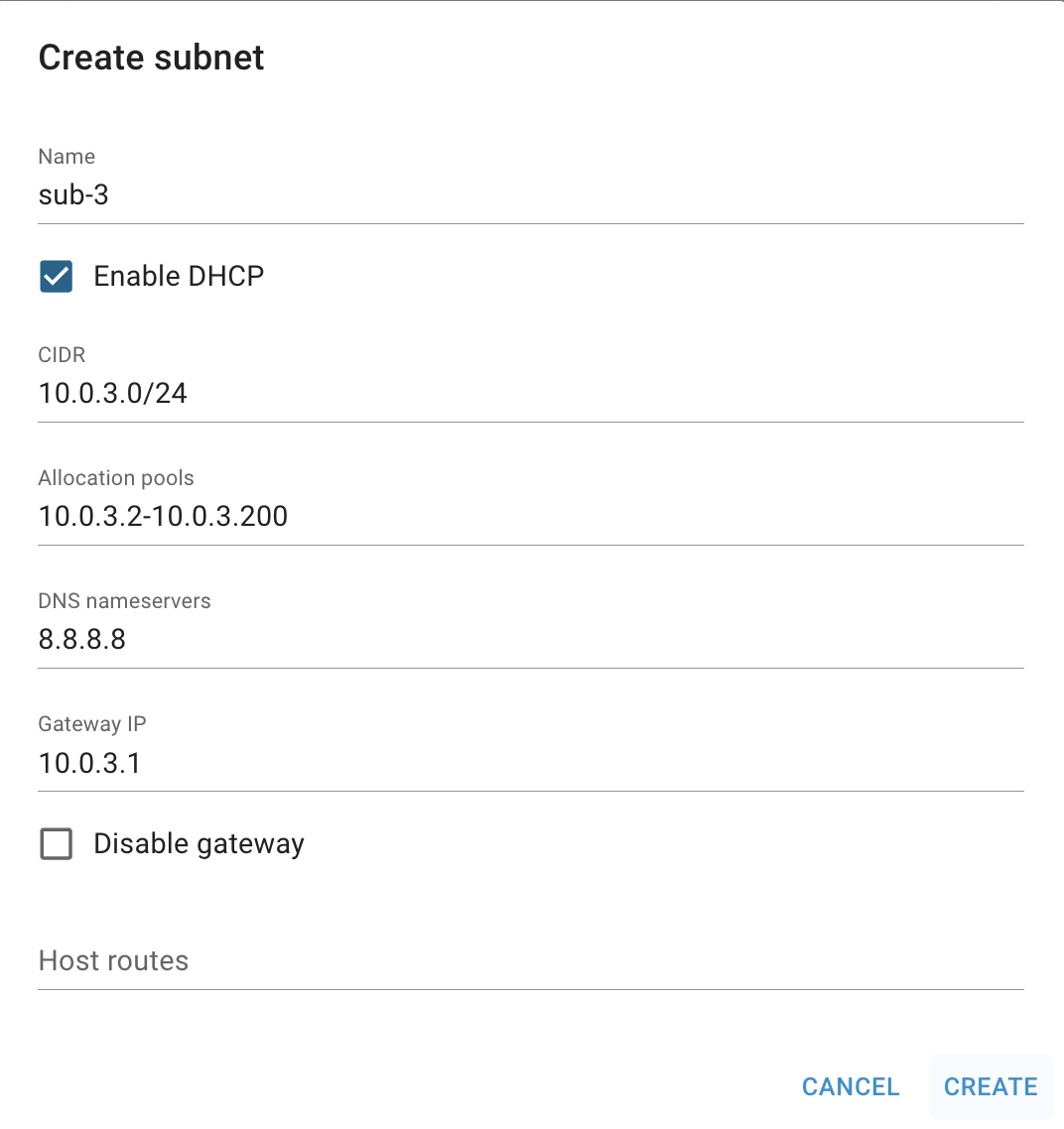 - update the Name, Allocation pools, DNS nameservers, Gateway IP, Host routs or state of DHCP and gateway state on the next opened Edit Subnet window, and click on the SAVE icon: